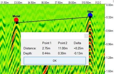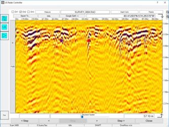 Los Radargramas se muestran como cortes en la tierra, a medida que el Georadar se desplaza sobre la superficie se van generando estos, donde la parte superior corresponde a la superficie y las líneas horizontales y/o la escala a la derecha, representan la profundidad en metros.